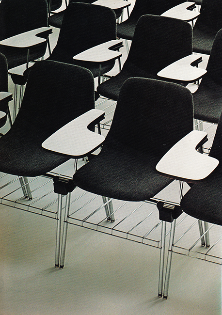 La serie è completata da sedute dedicate realizzate in pressofusione, imbottite e totalmente rivestite, sono montate su due tipi disupporti: a quattro gambe o a base girevole su ruote, con o senza braccioli e piano di scrittura.